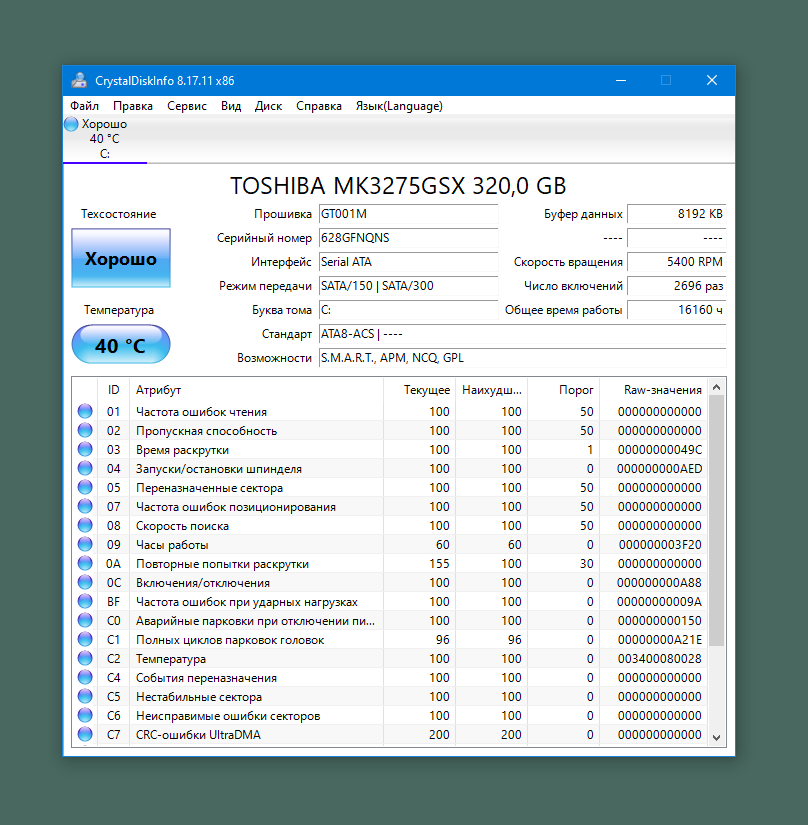 При помощи CrystalDiskInfo можно просмотреть детальную информацию о накопителях, установленных в компьютере, а также перечень параметров системы самодиагностики S.M.A.R.T. Программа поддерживает локализации, а также сменные темы. В дополнение утилита динамически отслеживает изменения параметров для всех накопителей в системе и позволяет отображать это на графике. Присутствует поддержка для внешних накопителей с интерфейсами USB и IEEE 1394. Полный перечень поддерживаемых чипов и контроллеров можно найти на официальном сайте (подробнее). Так же реализована возможность управления AAM и APM для внешних устройств